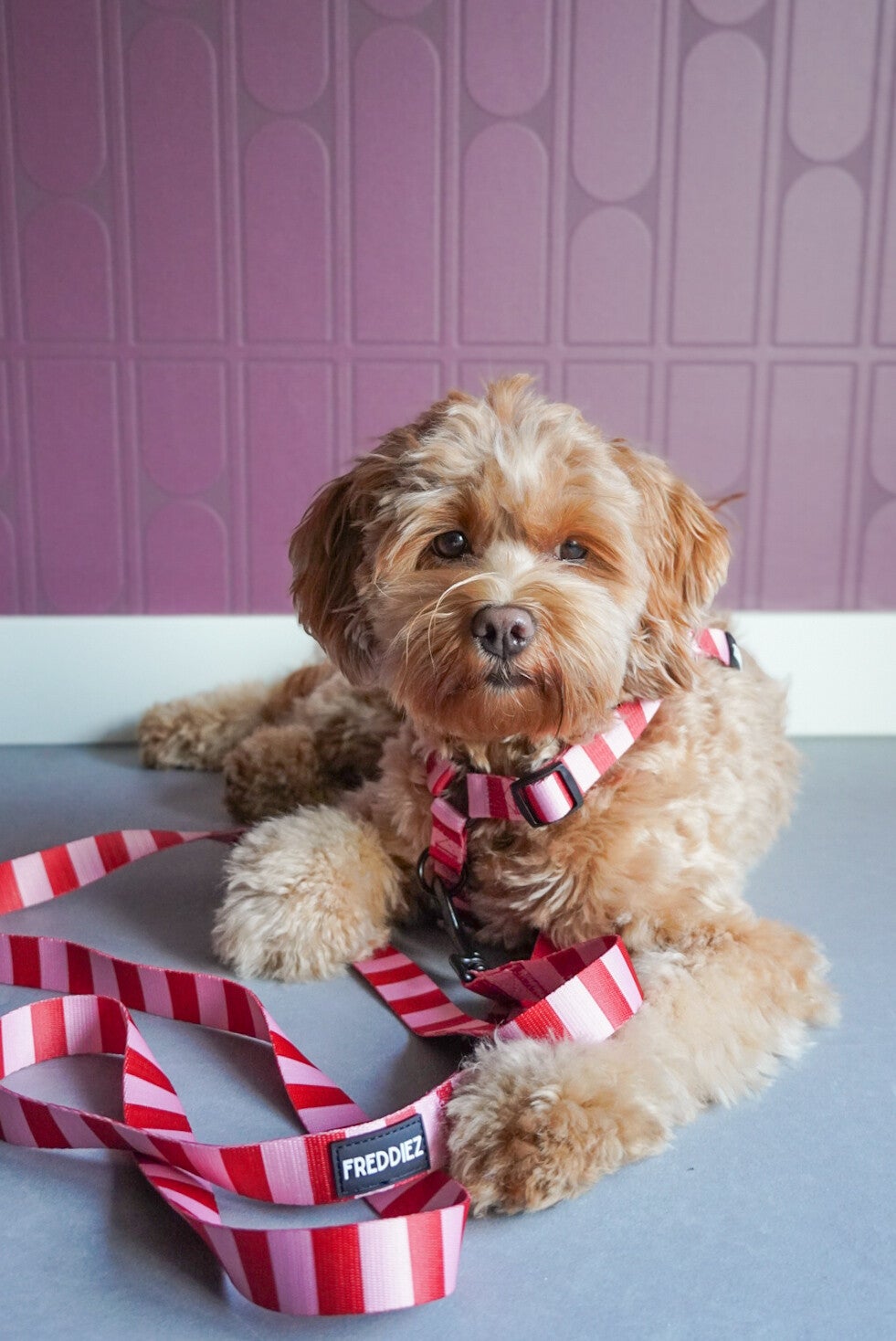 Ben jij klaar om te shinen in deze fantastische set? Dan ben je hier op het goede adres! Hoé vet is het als jouw viervoeter over straat kan in dit roze met rodegestreepte tuigje?